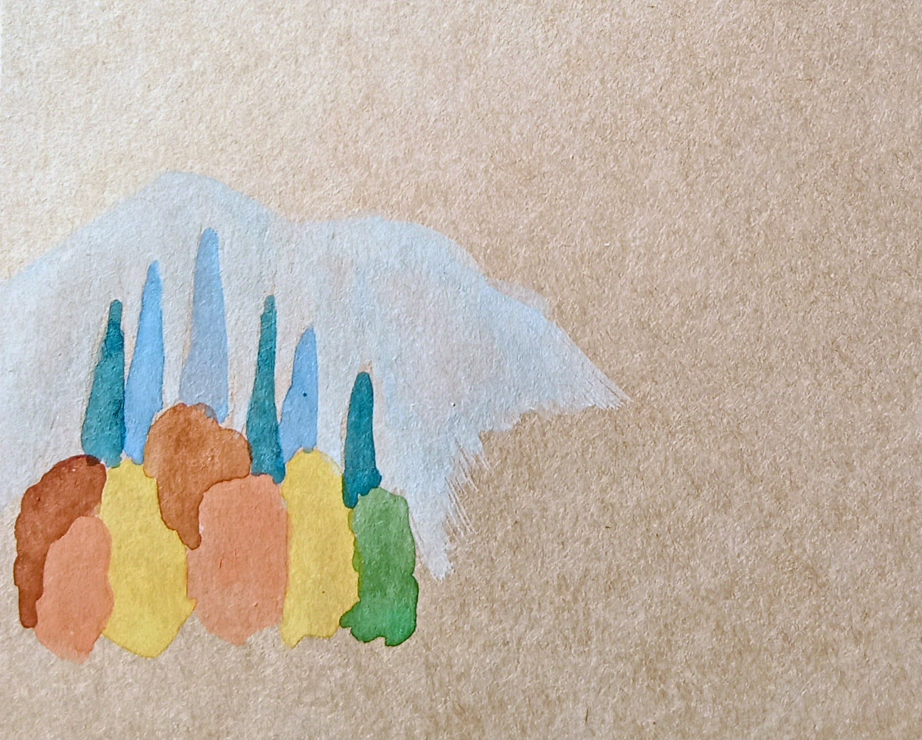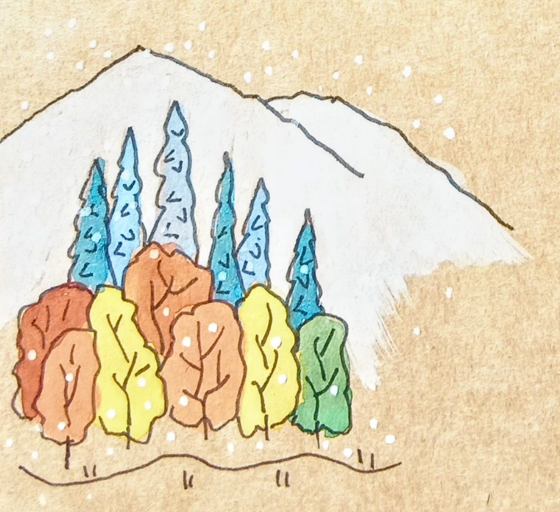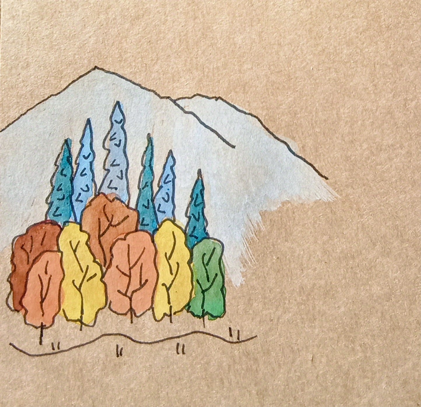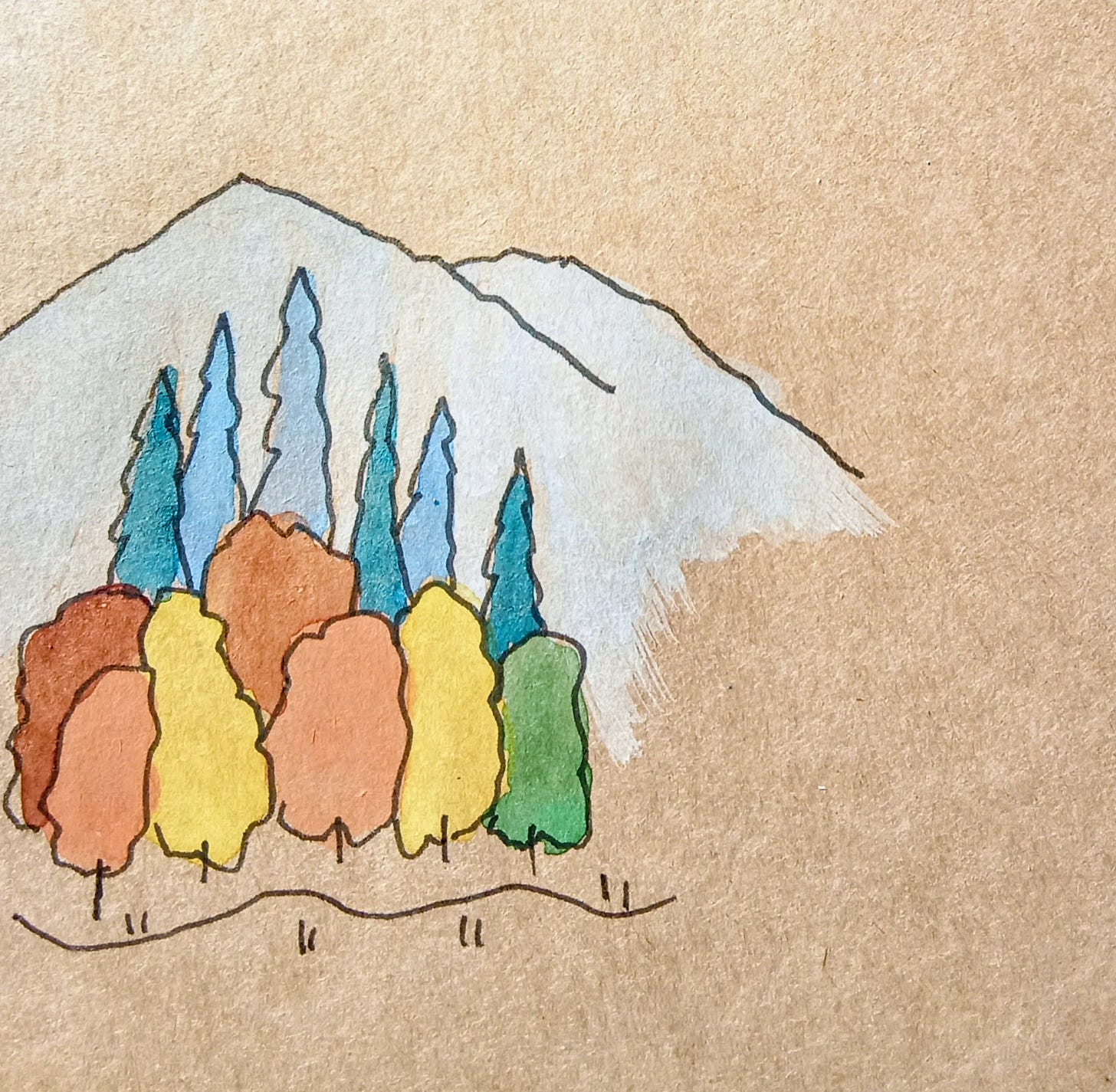 Maintenant que toutes les couleurs sont en place, nous pouvons commencer à tracer les contours des formes avec un feutre fin (ou même un stylo noir). Il n'est pas nécessaire d'être extrêmement précis ; en fait, je pense qu'un léger chevauchement fonctionne bien dans ce cas. Pour les pins, j'ai fait de légers zigzags. Nous ajoutons également un fond très stylisé sous les arbres.