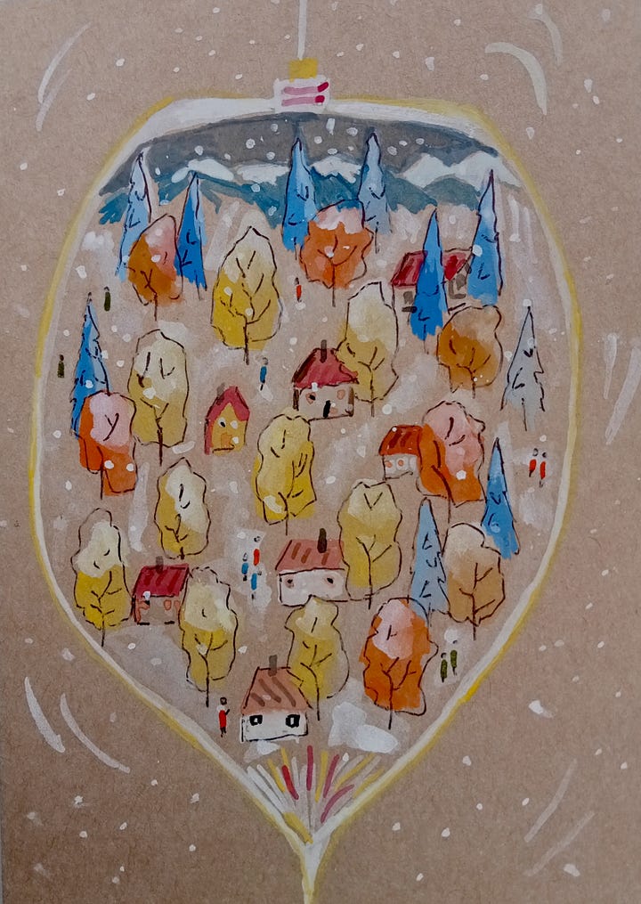 À gauche, celui que je vous ai montré, au-dessus, celui peint à l'acrylique, et à droite, celui peint aux marqueurs. Dans les trois cas, j'ai utilisé le même feutre fin noir et l'aquarelle blanche pour les flocons de neige. Attention, l'acrylique met un peu plus de temps à sécher ; attendez donc un peu avant de commencer avec le feutre fin.