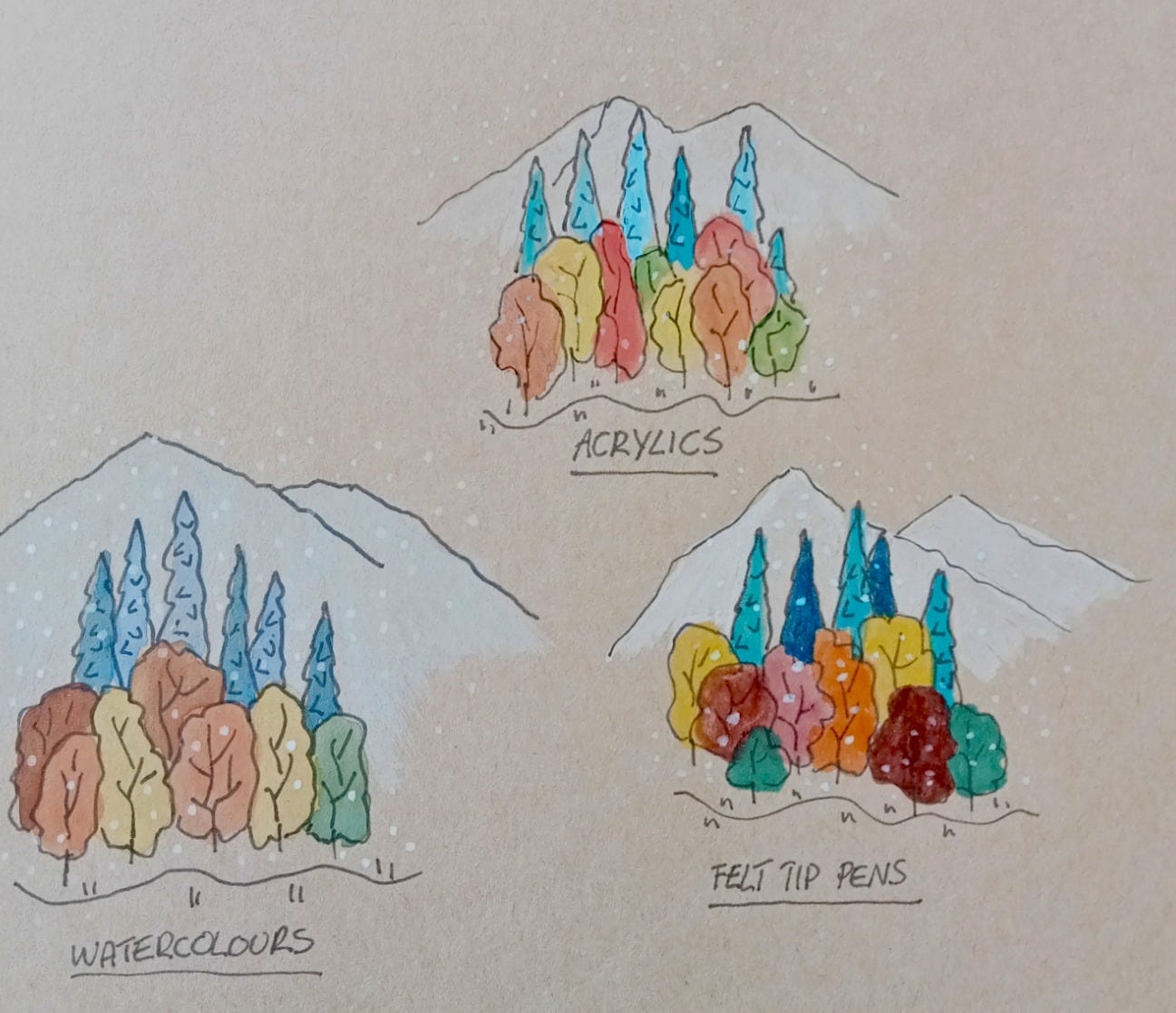 Sur la photo ci-dessous, vous pouvez voir que j'ai recréé le même paysage avec différentes techniques, obtenant des résultats variés, tous plutôt réussis, je dirais.